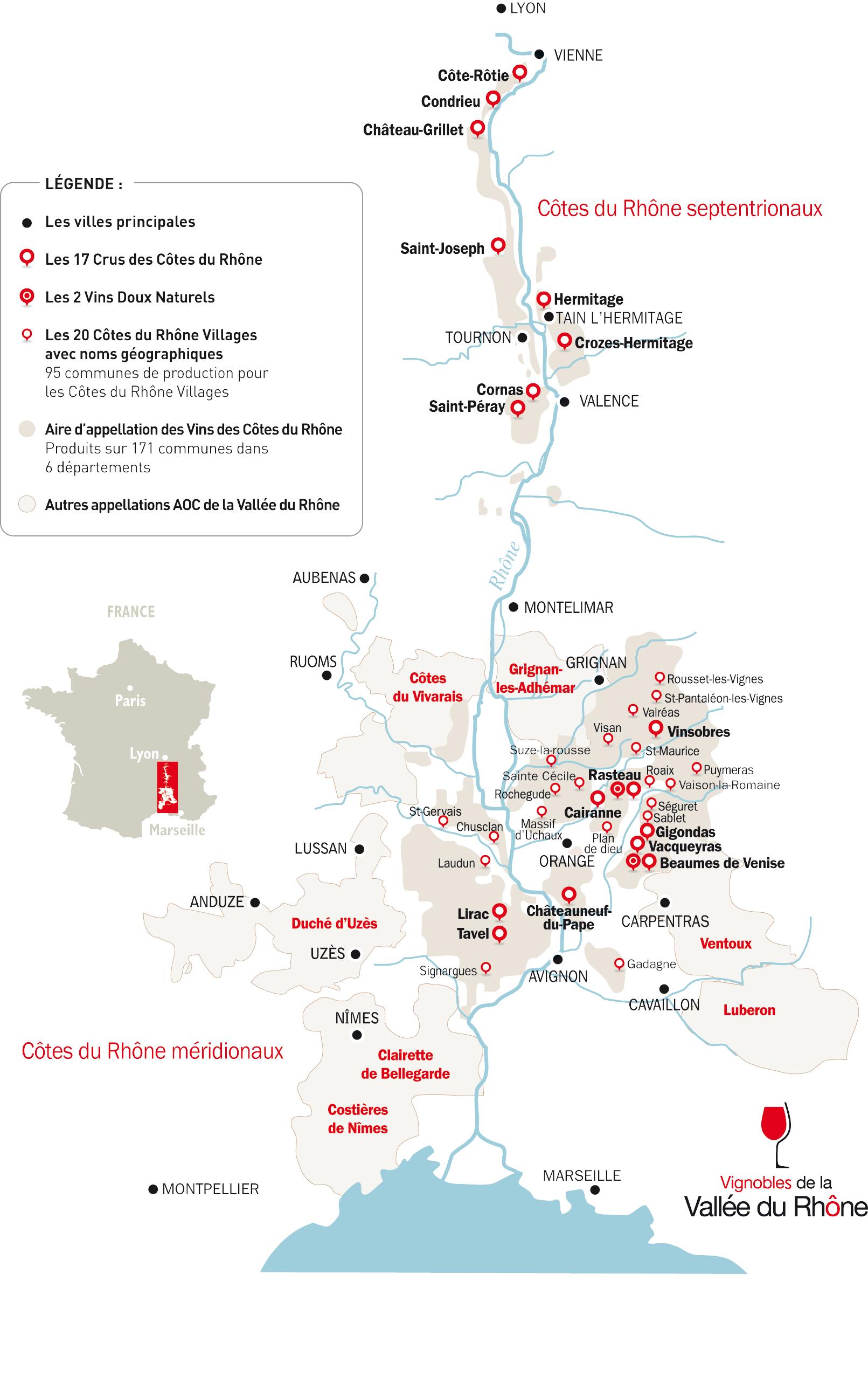 - CROZES-HERMITAGE : Situé sur le Nord de l’AOC, sur les communes de Gervans, Crozes, Erôme et Larnage, où la majorité des parcelles est en coteaux.